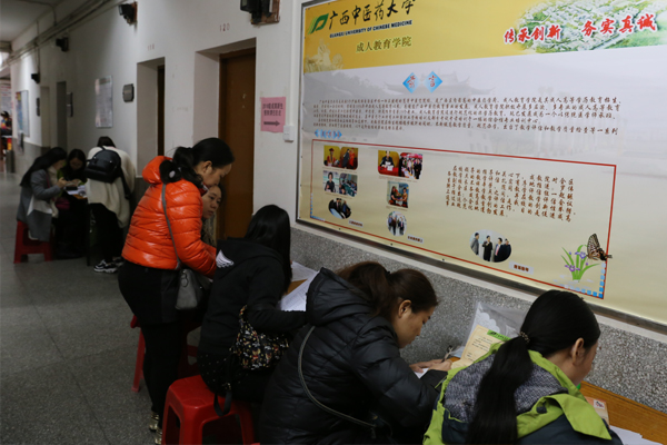 1月8日,成人教育学院2016级新生到校报到入学,学校罗伟生副校长在成人教育学院韦艾凌院长、直属党委蒋林书记、成教院黄瑞诚副院长的陪同下现场检查指导2016级新生接待工作。