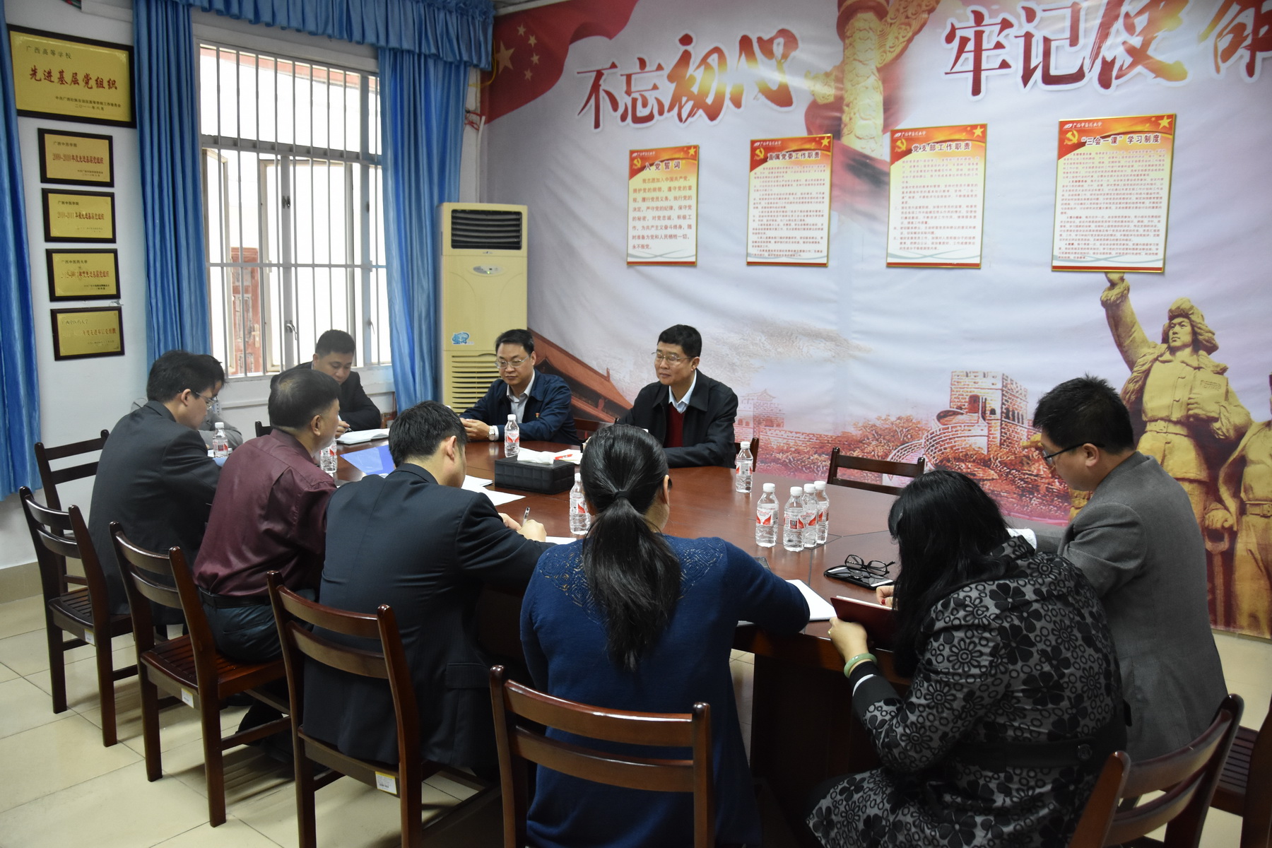 尤剑鹏一行实地考察了成教院的办公场所,详细了解办公情况,并就关心的问题与成教院职工亲切交谈。随后与成教院领导班子和全体职工进行了座谈,认真听取了院长韦艾凌就直属党委、成人教育学院的工作、现状、取得的成绩以及存在问题所做的汇报。成教院副院长黄瑞诚就成教院近年开展的教学检查评估、教学管理常态化检查、全区成高统考等系列工作进行了补充汇报。直属党委副书记、成教院副院长覃振林就直属党委的相关工作也进行了汇报。