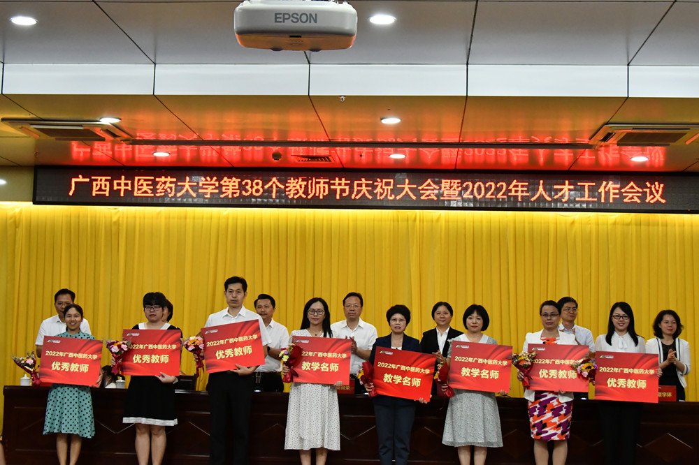 会上,何并文宣读表彰名单,主席台上的校领导为第四批国医大师,第二批全国名中医,第二批全国高校黄大年式教师团队,第七批全国老中医药专家学术经验继承工作指导老师,2022年桂派中医大师、2022年广西岐黄学者、国家中医药管理局青年岐黄学者,广西教学名师、广西优秀教师、优秀教育工作者等先进个人、先进集体颁奖。