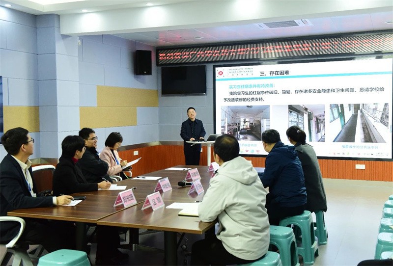 检查组深入教学一线实地调研。在走访实习生宿舍时,钟宏桃详细询问学生住宿情况,现场体验智慧教室多媒体设备,强调要持续优化“医教协同”育人环境。检查组还与教学管理人员就课程建设、实践教学等环节进行交流。学院党委副书记胡跃强围绕开学准备工作、教学工作亮点、存在困难和展望四个方面,向学校检查组做了专题汇报。