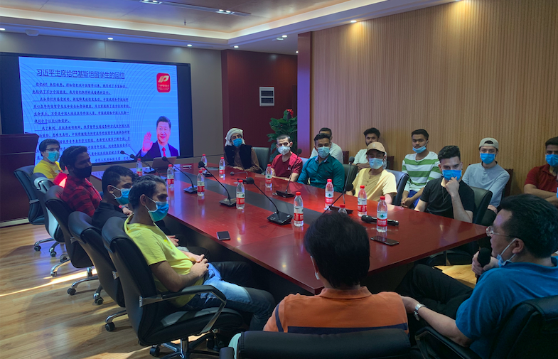 2020年5月19日早上八点半,国际教育学院院长蒋基昌、副院长韦文朗与全体 在校 巴基斯坦 籍留学生在留学生公寓楼三楼会议室 进行 了一次别开生面的 座谈, 大家 共同学习 了 中共党中央习近平总书记 在5月17日 给北京科技大学全体巴基斯坦留学生的回信。