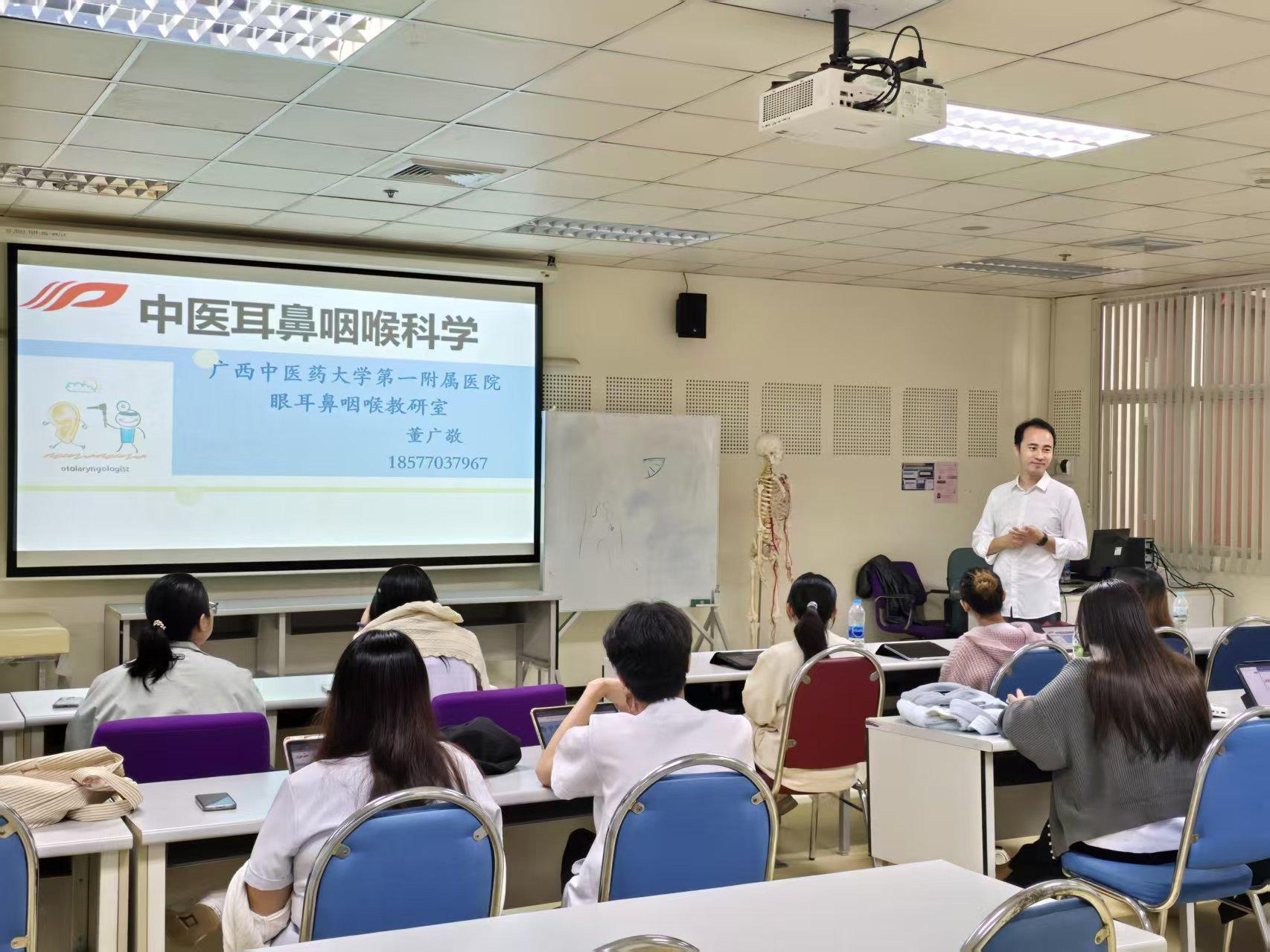 应泰国碧瑶大学邀请,学校选派第一附属医院耳鼻喉科主治医师董广敬、妇科主治医师郭华赴泰执行教学任务。两位教师于11月6日起,在泰国碧瑶大学开展为期一个半月的中医课程教学,分别为该校中医系本科生讲授《中医眼耳鼻喉学》与《中医妇科学》。