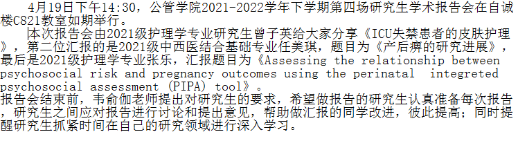 公共卫生与管理学院举行2021-2022学年下学期第四场研究生学术报告会