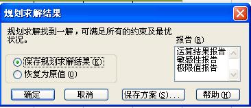 在选项按钮中可以选择求解线性规划和假定非负,点击求解按钮出现下图,选中报告后并保存求解结果:
