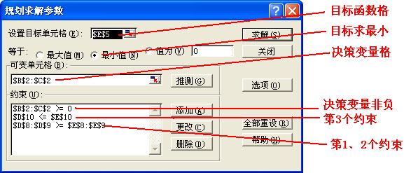 用鼠标左键单击〔工具〕菜单中的〔规划求解〕选项,弹出〔规划求解参数〕对话框,对话框参数解释如下: