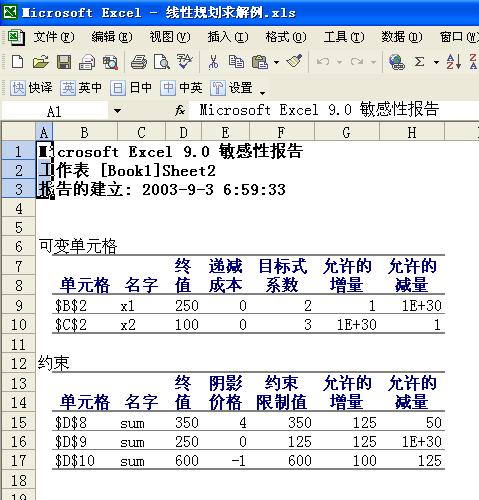 当所有参数都设置完使,点击求解按钮,将显示求解结果,同时可以根据求解结果显示相关敏感分析报告。