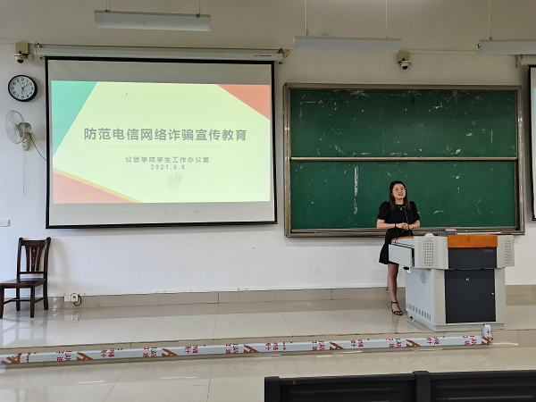 为了提高同学们防范电信网络诈骗的意识和防范技能,公共卫生与管理学院于2021年6月6日18:00在仙葫教学楼1-201召开防范电信网络诈骗宣传教育会,会议由辅导员唐梧茜宣讲,2020级全体同学参与了此次会议。