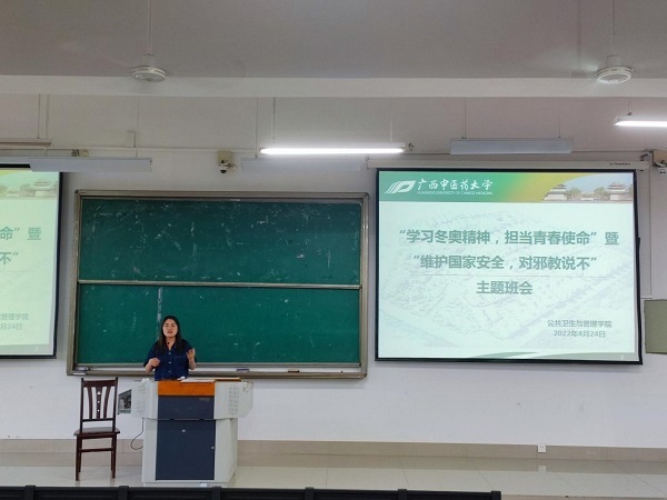 为学习贯彻习近平总书记给中国冰雪健儿重要回信精神,开展2022年全民国家安全日宣传教育,唐梧茜于2022年4月24日18:00和18:30在仙葫校区教学楼1-201开展2场“学习冬奥精神,担当青春使命”暨“维护国家安全,对邪教说不”主题班会。班会由辅导员唐梧茜主讲,2021级健康服务管理专业、信息管理与信息系统专业学生121人及2020级各班学生232人分别参加了会议。