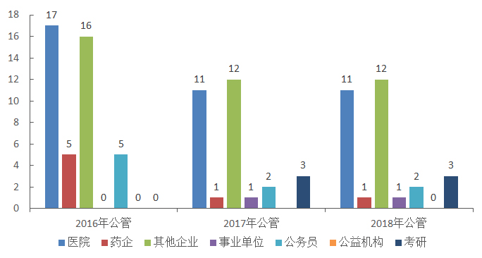 公共事业管理专业近三年(2016年—2018年)来就业情况良好,2016年进入医院工作的毕业生有17人,2017年11人,2018年11人,包括beat365官方网站第一附属医院、瑞康医院、广西国际壮医院、海南省第二人民医院、南宁市第二人民医院、深圳仁爱医院、南宁市妇幼保健院、桂林市中医院、贵港市中医院,河池市中医院、梧州市人民医院,贺州市妇幼保健院、全州县疾病预防控制中心、广东省阳江市中西医结合医院、广东省江门市新会区第二人民医院、广东省江门市蓬江区中西医结合医院,以及各县级人民医院。进入制药及医药销售企业工作的毕业生共7人,其他各类企业工作40人,以及进入政府机关、事业单位,考上广西医科大学等院校硕士研究生共6人。