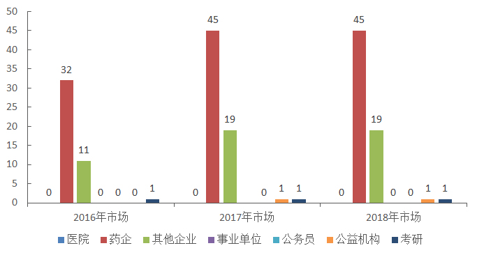 市场营销专业近三年来(2016年—2018年)就业形势良好,毕业生就业率达到90%以上,其中进入医药企业就业的毕业生达122人,其他类型企业49人,包括西安杨森制药有限公司、中国中药有限公司、石药集团、杭州中美华东制药有限公司、赛诺菲制药有限公司、诺和诺德(中国)制药有限公司、上海同联制药有限公司、上海罗氏制药有限公司、北京同仁堂有限公司、东阿阿胶股份有限公司、等国有企业、外资企业、还有的毕业生考上公务员或进入事业单位以及考上硕士研究生5人。