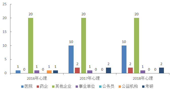 心理学专业毕业生近三年来(2016年—2018年)就业形势良好,进入医疗机构工作21人,例如解放军三O三医院、解放军总医院海南分院、柳州市柳铁中心医院、福泉市第一人民医院等医疗机构。进入各类企业工作60人,药企4人,政府机关公务员、事业单位、考研若干。