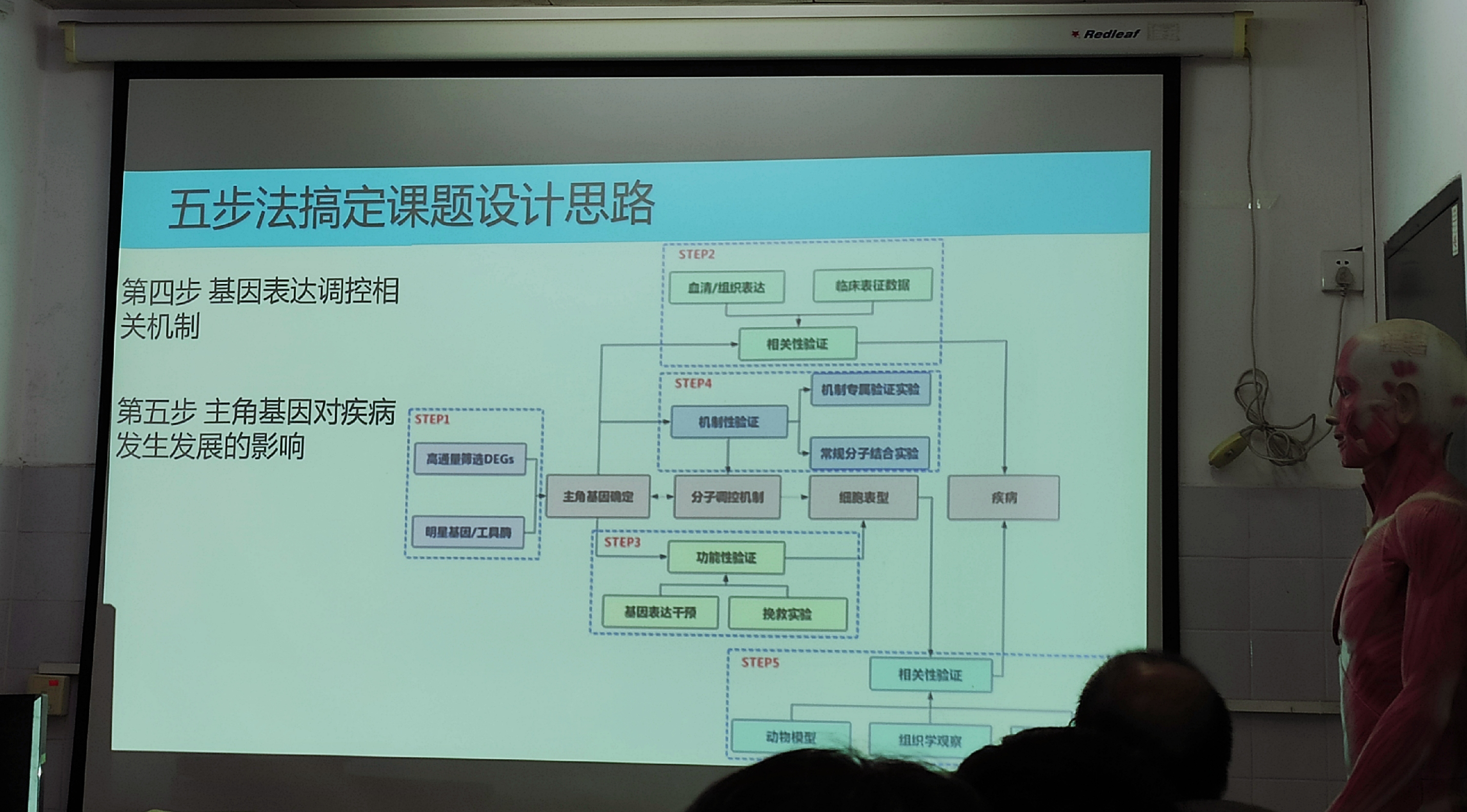 张弛博士首先给同学们细致地讲解了科研课题设计的相关重点内容,同时采用图文并茂方式分析了医学基础研究课题设计的流程,并现场指导同学们如何应用众多的信息查询工具以及数据库。随后,张弛博士为同学们逐条分析了在课题设计中易出现的问题,并提醒同学们在课题设计中,注意研究对象的一致性以及研究范围的适度性。针对论文撰写格式问题,张弛博士强调在论文框架搭建过程中关注图表、标注、参考文献以及排版格式的规范,做到对论文整体内容的精准把控,最后予以打磨和润色。同时,张弛博士提醒同学们运用规范的外文查询库,以防出现“钓鱼网站”导致自己的论文内容外泄。要特别注意研究内容的时效性、权威性和创新性。