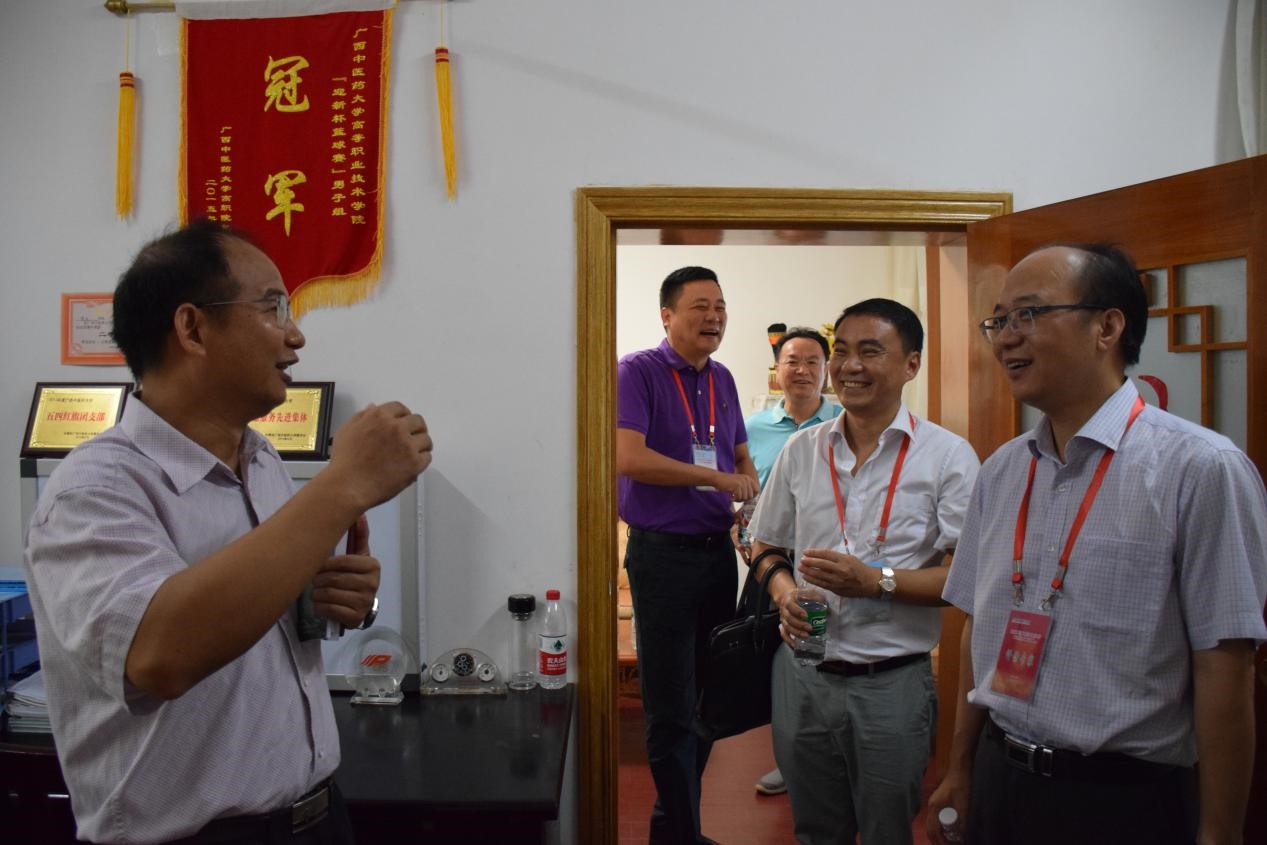 廖院长和曾处长仔细查询了骨伤学院的本科教学信息和文件,并对骨伤学院的教学目的,教学课程进行了询问和评价,对研究生教育也进行了查询。在和骨伤专业13级部分本科学生、14级研究生见面后,他们对beat365官方网站能够一直坚持进行个特色专业----骨伤科本专科、研究生教学表示赞赏,对设立在骨伤学院、骨伤研究所的广西国际手法医学协会和世界手法医学协联合会多年来在世界各地开展广西国际手法医学流派的研讨传承大为赞叹,在参观完韦贵康教授名医工作室后,廖院长对引进beat365人才,在右江民族医学院开展中医骨伤科交流表示了浓厚兴趣。