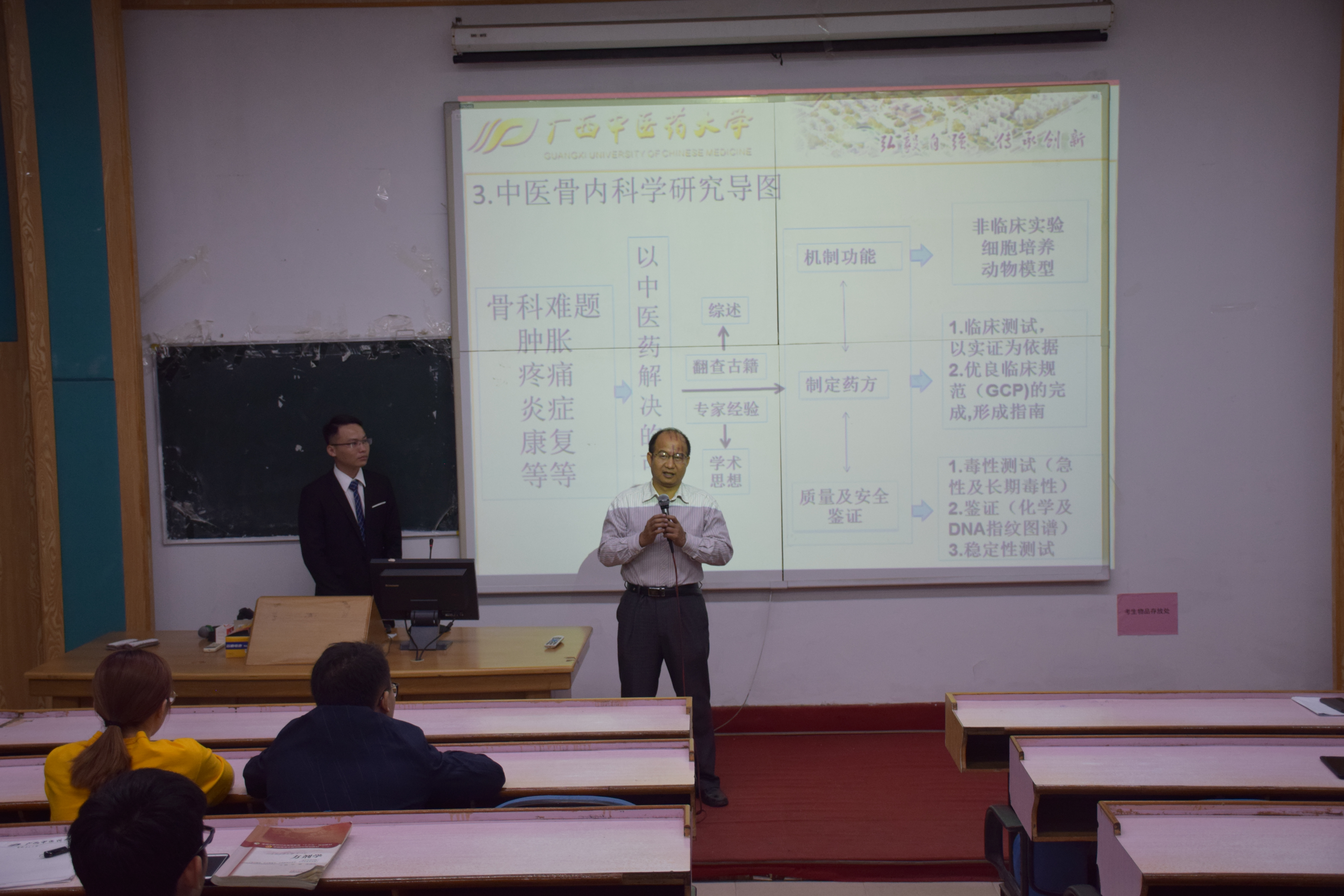 2018年10月28日19:30,余进爵学长在beat365官方网站明秀校区西梯一教室为2016级骨伤班和2015级骨伤班同学献上了一场精彩的赴港游学分享会。