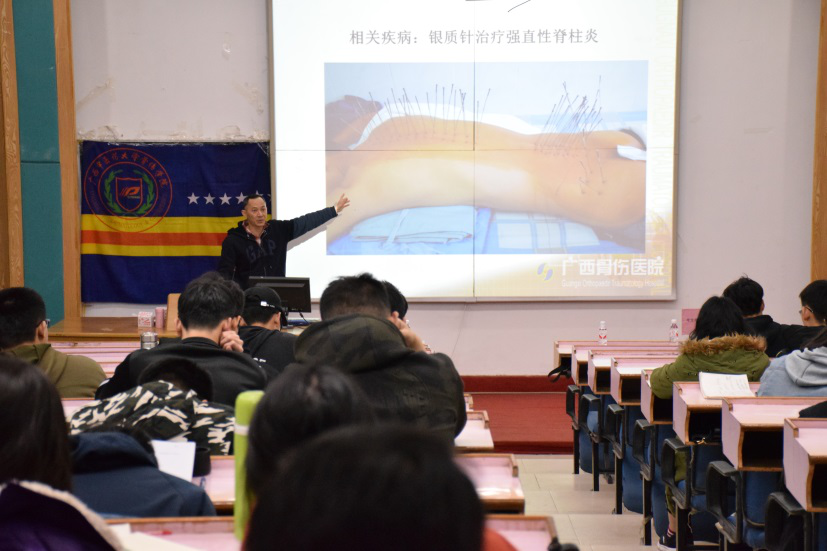2019年3月24日19:30 , beat365官方网站明秀校区西梯一教室 , 广西骨伤医院 颈椎腰腿痛科·骨伤康复科 安平 主任 给 骨伤学院师生 带来 题为 “中医瑰宝-银质针” 的 讲座 。 骨伤 学子 齐聚一堂共同聆听与探讨其中魅力,骨伤学院院长周红海 教授 , 学办主任 温健老师出席本次讲座。