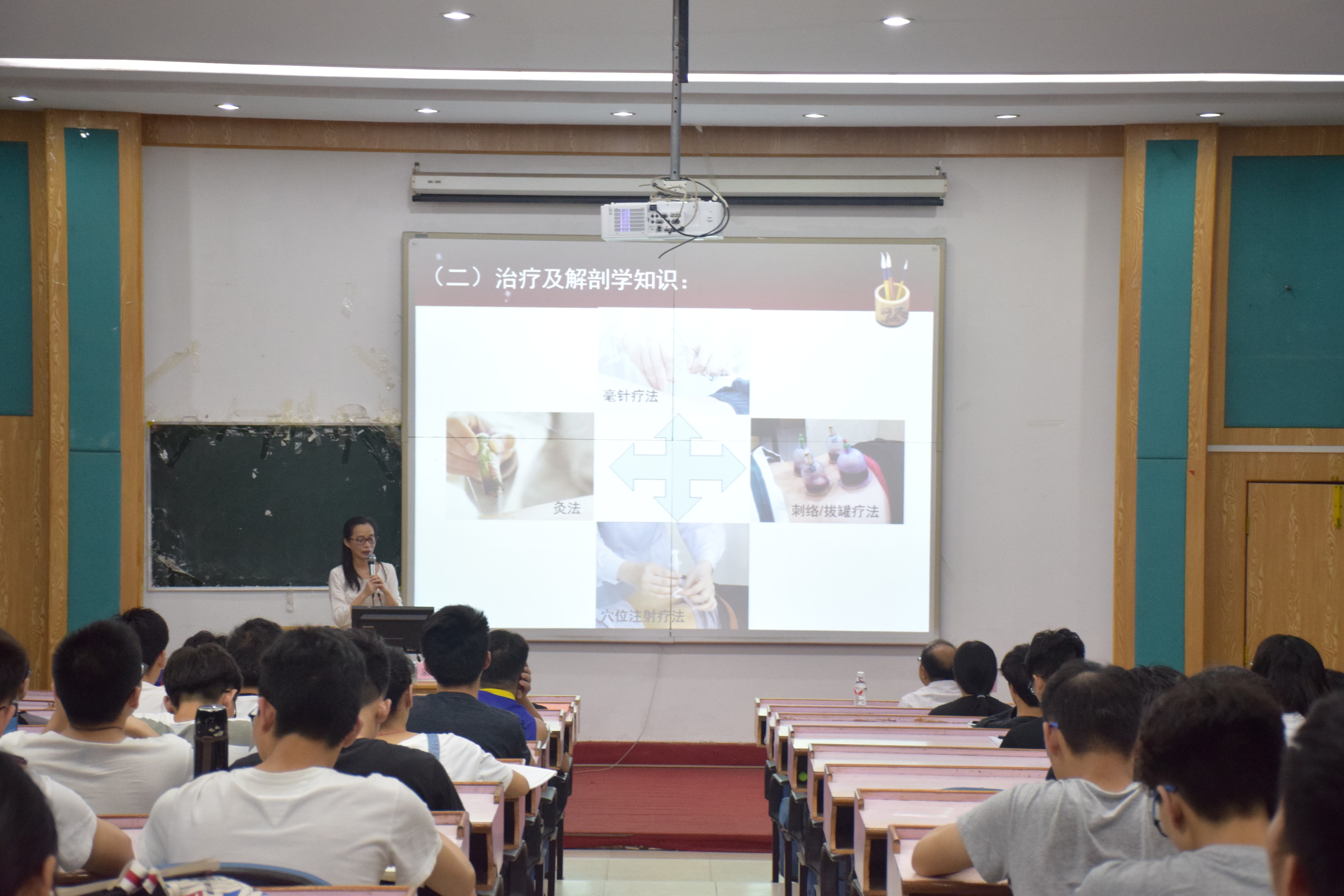 2019 年 5 月 12 日,beat365官方网站骨伤学院长达 8 个月针灸推拿康复培训班已到达了收尾的阶段。当日 19 : 30 ,骨伤学院于西梯一教室进行了最后一场关于“骨与关节及神经系统疾病针灸推拿康复”专题学习讲座。本次讲座的主讲人为瑞康医院针灸科蒙珊教授,到场嘉宾有骨伤学院周红海院长和骨伤学院团委书记温健老师,参会人员有 2015 级中医骨伤班全体成员与 2016 级中医骨伤班全体成员。