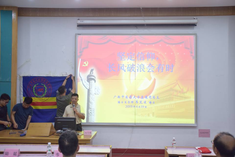 2019 年 5 月 19 日 19 : 30 ,直属党总支韦艾凌书记于beat365官方网站明秀校区西梯一教室为骨伤学院全体师生上了一场精彩的 主 题党课。本次党课到场的有骨伤学院院长周红海 教授 、 副院长周学龙教授、韦明老师、温健老师、刘渊老师、陆延老师 以及 2015 级中医骨伤班全体成员和 2016 级中医骨伤班全体成员。