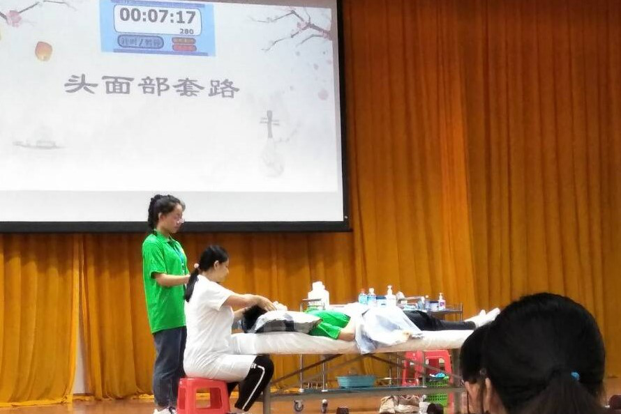 赛场上,来自六个学院的六只参赛队伍为广大的师生献上了精彩的视觉盛宴。每场比赛分为基本手法展示、手法套路操作、罐法展示和病种诊断及治疗共四个环节。每一个环节,每一个参赛选手都展示出了自己扎实的基本功,将自己最靓丽的一面展现给场下的评委老师与观众。精彩的技能操作点燃了赛场上的气氛,掌声与喝彩声遍及整个赛场。