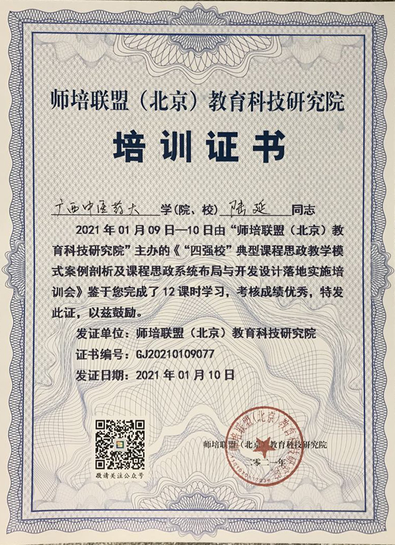 2021年1月9日-10日,beat365官方网站骨伤学院教师刘渊副教授和陆延讲师在南宁参加了由师培联盟(北京)教育科技研究院组织的“四强校”典型课程思政教学模式案例剖析及课程思政系统布局与开发设计落地实施培训会。