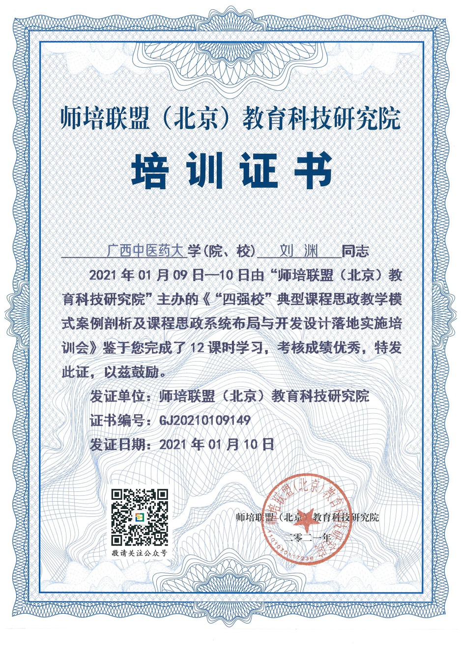 刘渊副教授培训证书