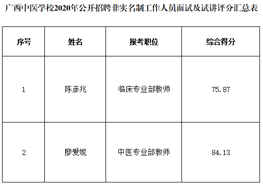 广西中医学校(beat365官方网站附设中医学校)2020年公开招聘非实名制工作人员面试成绩及试讲成绩公告 发布时间:2020-05-25 10:11:02 浏览次数: 次 【字体:小 大】 根据《广西中医学校(beat365官方网站附设中医学校)2020年公开招聘非实名制工作人员符合条件人员公示》,学校于2020年5月21日上午对应聘人员进行面试及试讲,现将成绩公示如下,请各位考生自行查阅。 2020年5月22日 分享到: 【打印正文】