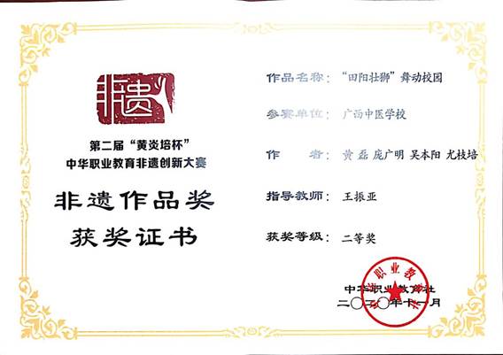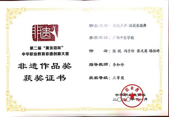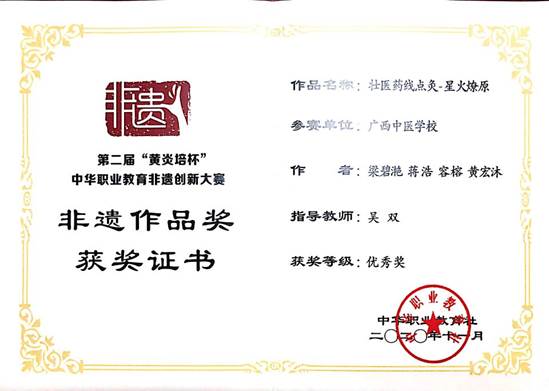 2020年11月15-17日,由中华职业教育社主办、教育部指导的第二届“黄炎培杯”中华职业教育非遗创新大赛暨非遗职业教育成果展示会在重庆女子职业高级中学举行,来自全国26个省市115所职业院校的418个非遗项目展开激烈角逐,beat365选送的4个作品,分别获得了1个二等奖、1个三等奖和2个优秀奖,beat365申报的教学成果“医教协同·非遗传承·中壮瑶医融合--广西民族医药特色技能人才培养的创新实践”获三等奖。