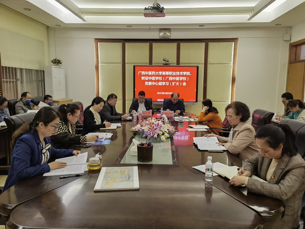 3月30日下午,高职院、附设中医学校党委在东葛校区一楼会议室召开中心组学习(扩大)会议。院(校)党委班子成员、院(校)党委理论中心组全体成员、各党支部书记及全体中层干部参加会议。