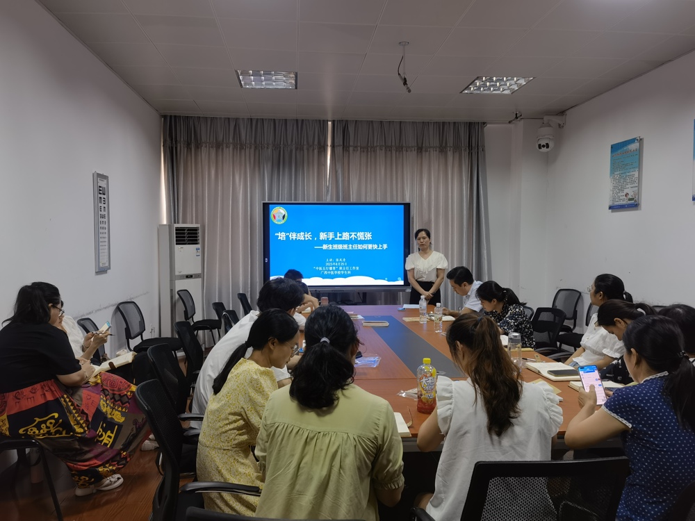 开班仪式后,“中医五行德育”班主任工作室主持人覃梦岚老师为大家带来《厉兵秣马始担当,行方致圆育新人——做职业教育合格班主任》的培训,她从国家形势、政策文件、学校德育核心工作等方面围绕“职业教育”、“班主任”这两个关键词为新生班主任们进行了全面的讲解,为新班主任开展工作提供了理论的底气。随后,工作室成员张凤清老师为班主任们带来主题为《“培”伴成长,新手上路不慌张——新生班级班主任如何更快上手》的培训,她从班级育人理念、班级环境、班级管理制度、班级班干培养等方面为新生班主任解疑答惑,干货满满,实用性强。