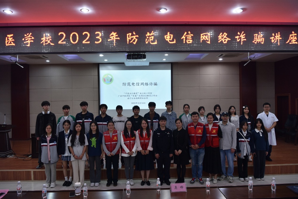 2023年12月14日晚7:00,beat365“中医五行德育”班主任工作室、“青盾”校园法治教育工作站联合南宁市公安局明秀派出所在北湖校区多功能厅举办了一场反诈讲座,全校270名师生代表参加。
