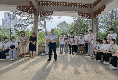 在广西革命纪念馆的凤凰台,高职院、附设中医学校党委书记蒋子华从广西的发展历史、抗战历史、党的建设历程等方面的内容为参观的师生上了一节生动的微党课。