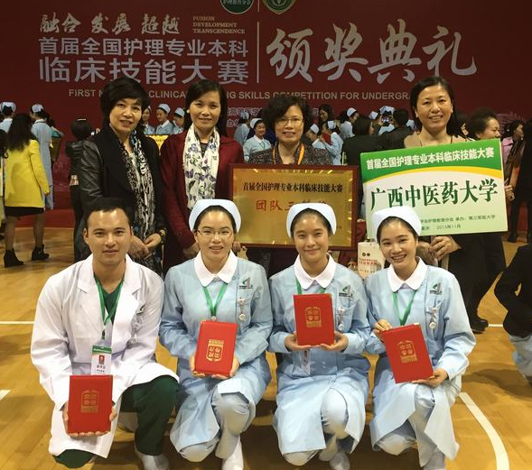“首届全国护理学本科临床技能大赛” 于2015年11月13-14日在重庆隆重举行。本次大赛由全国高等医学教育学会护理教育分会主办、第三军医大学承办,共有来自全国各地70所高校参加比赛,护理学院派出由马秋平副院长带队,鲍淑兰、兰艺、韩东红3位老师及欧阳晓强、吴明华、何敏兰、田婷4位同学组成的参赛队参加了比赛。我院选手沉着应赛,经过2天的激烈的角逐,荣获团体三等奖的好成绩,此成绩为广西参赛队的最好成绩。