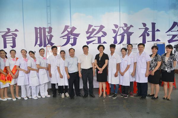 自治区教育厅副厅长黄雄彪与学校师生合影