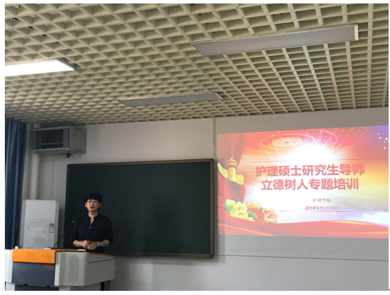 为进一步学习贯彻教育部印发的《关于全面落实研究生导师立德树人职责的意见》(教研〔2018〕1号),加强研究生导师队伍建设,助力青年教师发展提升,11月13日下午,护理学院在仙葫校区自诚楼C406举行了题为“立德树人--讲道德有品行,做优秀的人民教师”的专题讲座。讲座由护理学院党委书记、院长,全国教育系统先进工作者吴彬主讲。护理学院全体教职工、全体护理硕士研究生导师参加了本次学习。