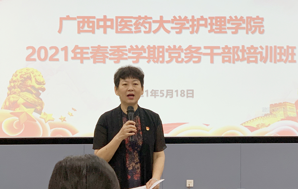 在党史学习教育不断深入开展之际,护理学院2021年春季学期党务干部培训班正式开班。5月18日下午,广西护理学会理事长、学校护理学学科带头人杨连招以《铭记丰功伟绩 增强使命担当》为题,在1号教学楼101教室给护理学院全体党员干部上了一堂精彩纷呈的专题党课。护理学院领导班子及师生党员代表近180人现场聆听授课。护理学院党委书记、院长吴彬主持。
