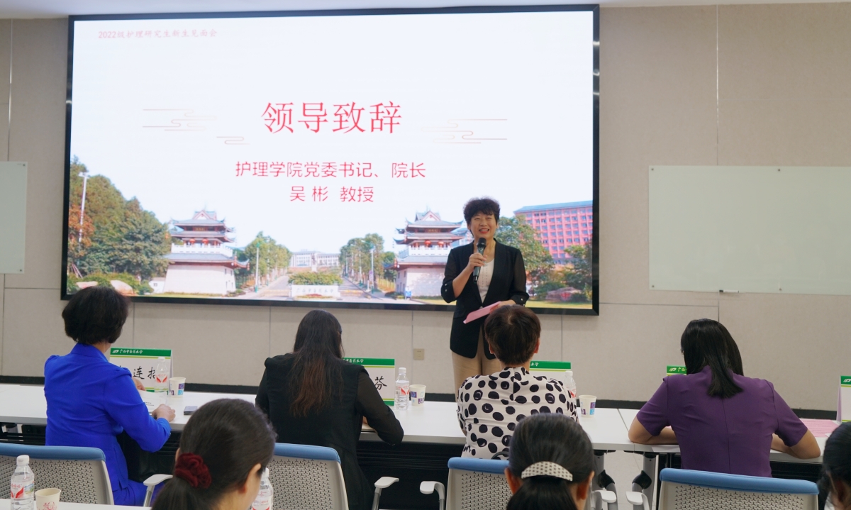 首先,吴彬对来自全国各地的2022级护理研究生新生表示衷心的祝贺和热烈的欢迎。她向同学们介绍护理学学科的发展历史,希望同学们要保持科研热情,勇于挑战,要心怀家国,坚定理想,还要保证身心健康,提升自我,秉承“弘毅自强、传承创新”的桂中医校训和“尚德、仁爱、精术、致新”的学风,开启美好的研究生生涯!