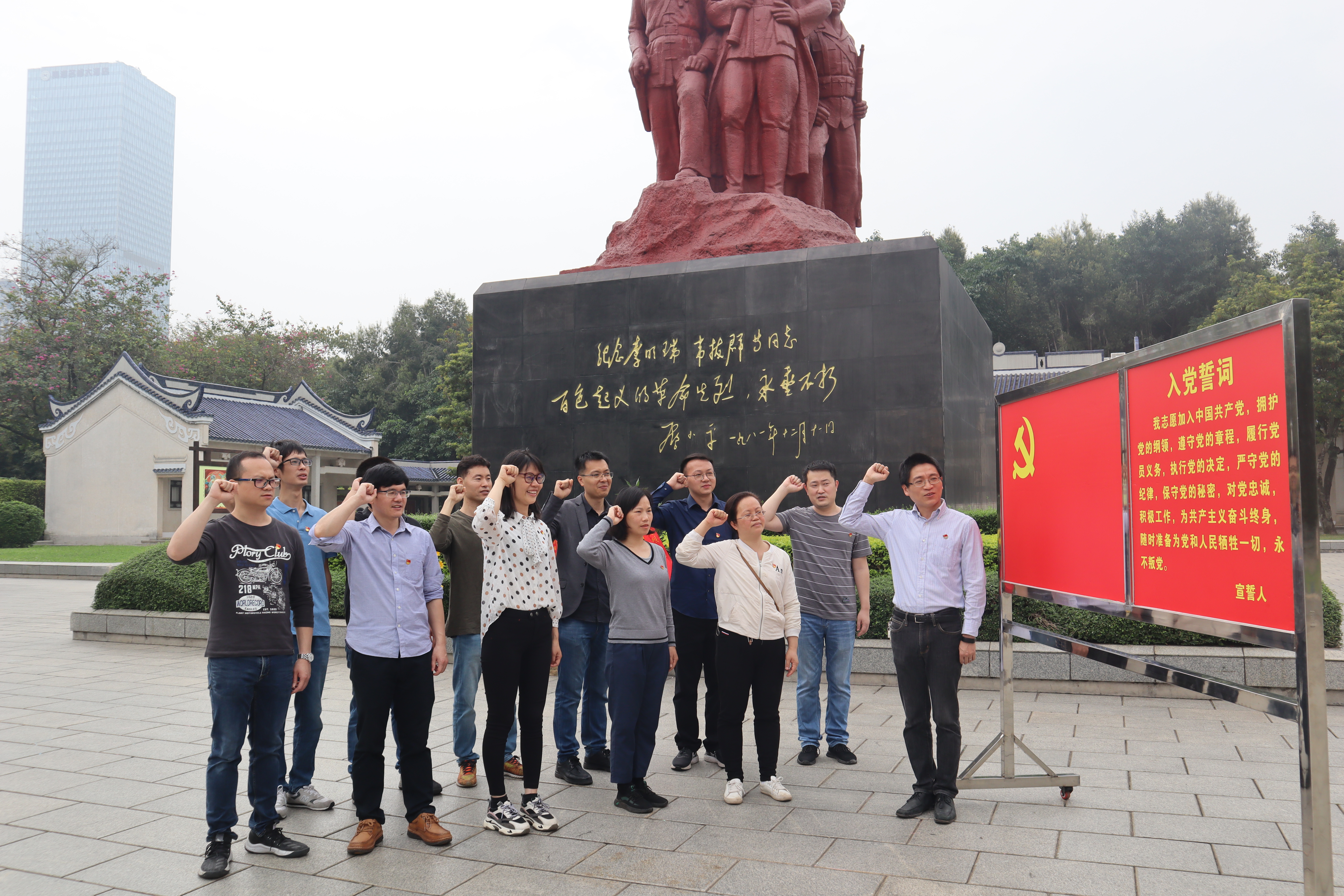 李明瑞、韦拔群烈士纪念碑碑文由邓小平同志亲自题写,面对庄重肃穆的烈士纪念碑,同志们默哀3分钟,向革命烈士表达深切悼念。随后,支部全体党员肃穆站立,对着党旗重温入党誓词:“我志愿加入中国共产党,拥护党的纲领,遵守党的章程……”。