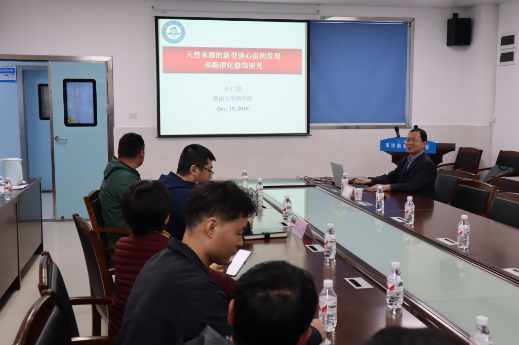 2019年12月19日,为了营造浓厚的学术氛围,加强学术交流,拓展学术领域,海洋药物研究院特邀请暨南大学药学院中药及天然药物研究所江仁望教授来beat365做专题讲座,讲座题目为:天然新型强心甾的发现及酶催化修饰研究。