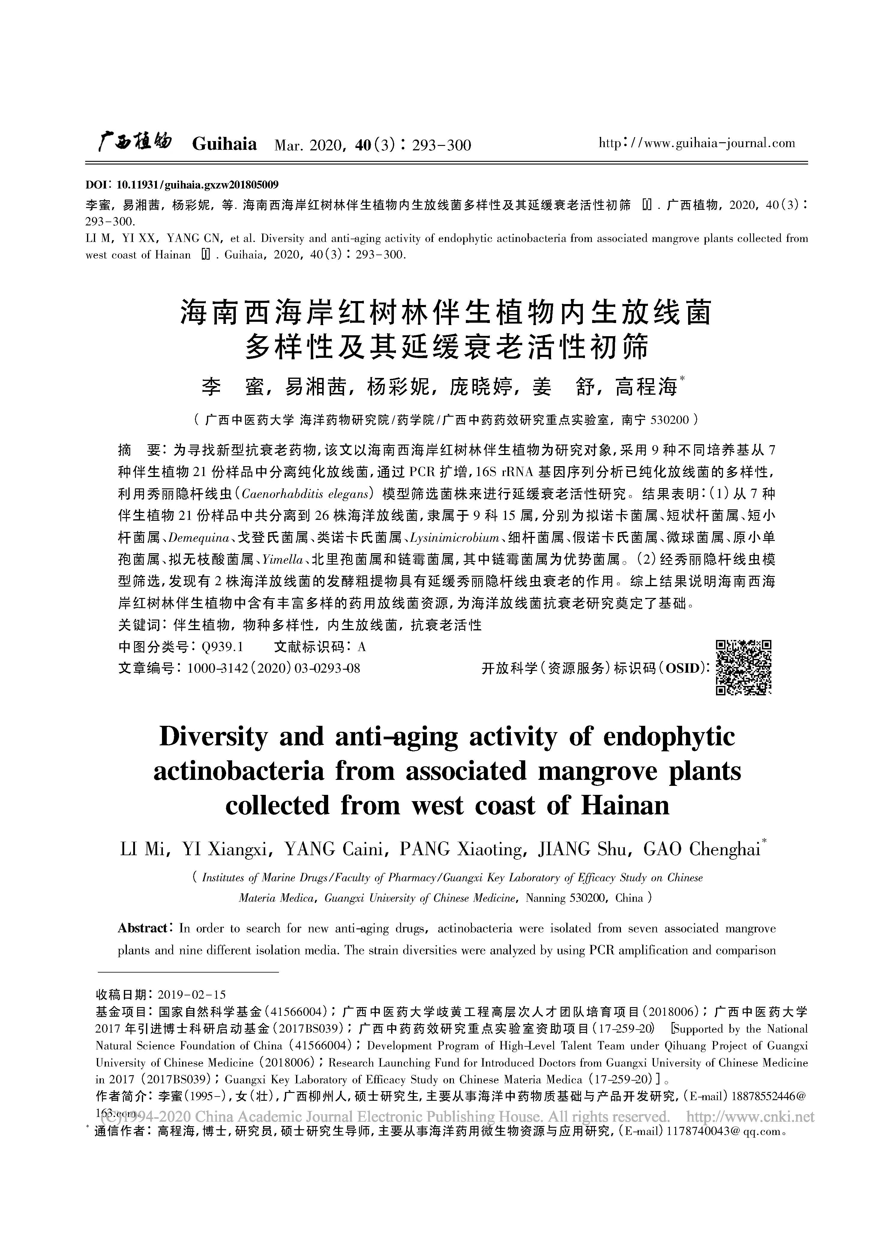 2020-海南西海岸红树林伴生植物内生放线菌多样性及其延缓衰老活性初筛