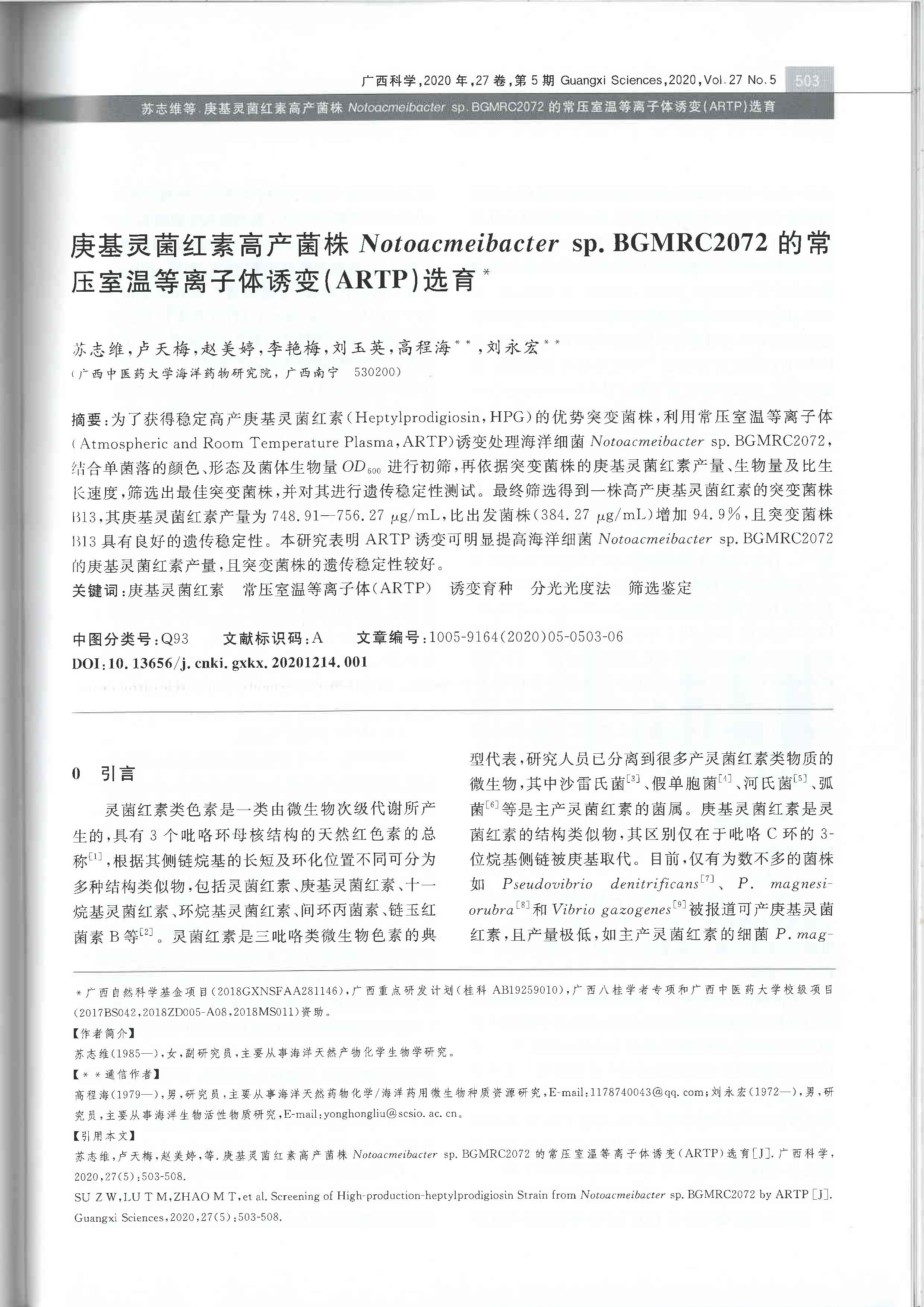 2020-庚基灵菌红素高产菌株 Notoacmeibacter sp.BGMRC2072的常压室温等离子体诱变(ARTP)选育