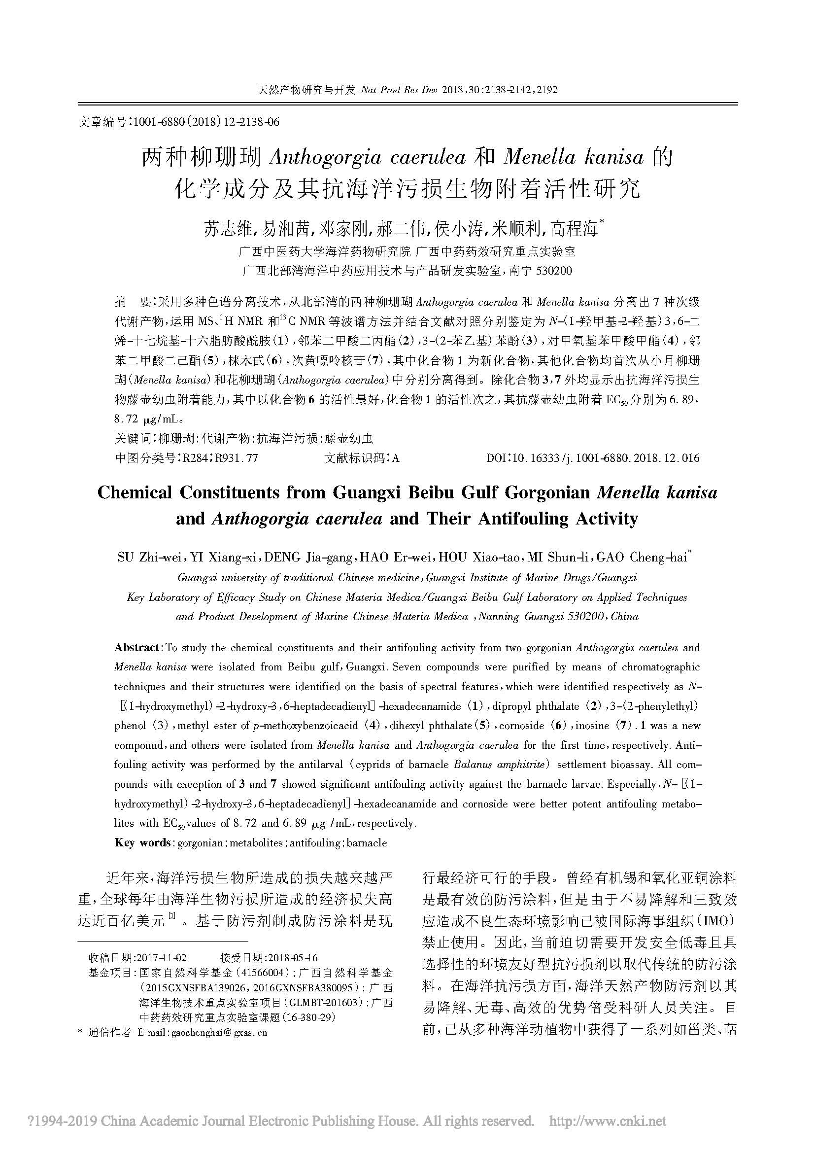 2018-两种柳珊瑚Anthogorgia caerulea和Menella kanisa的化学成分及其抗海洋污损生物附着活性研究 发布时间:2020-10-09 16:32:17 浏览次数: 次 【字体:小 大】 分享到: 【打印正文】