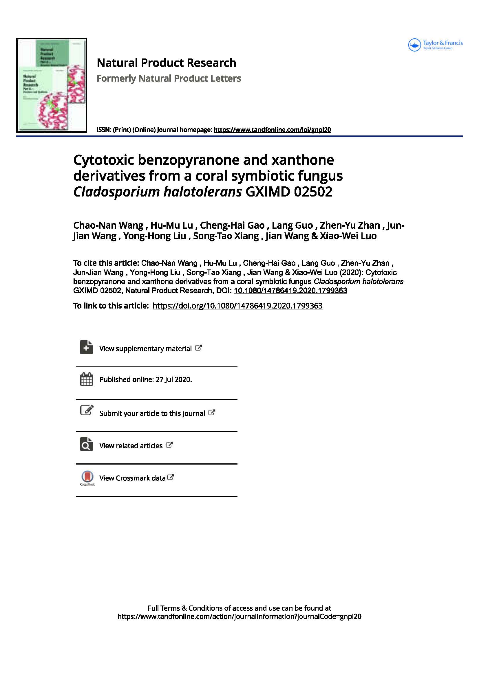 2020-Cytotoxic benzopyranone and xanthone derivatives from a coral symbiotic fungus Cladosporium halotolerans GXIMD 02502 发布时间:2020-10-21 10:06:57 浏览次数: 次 【字体:小 大】 分享到: 【打印正文】