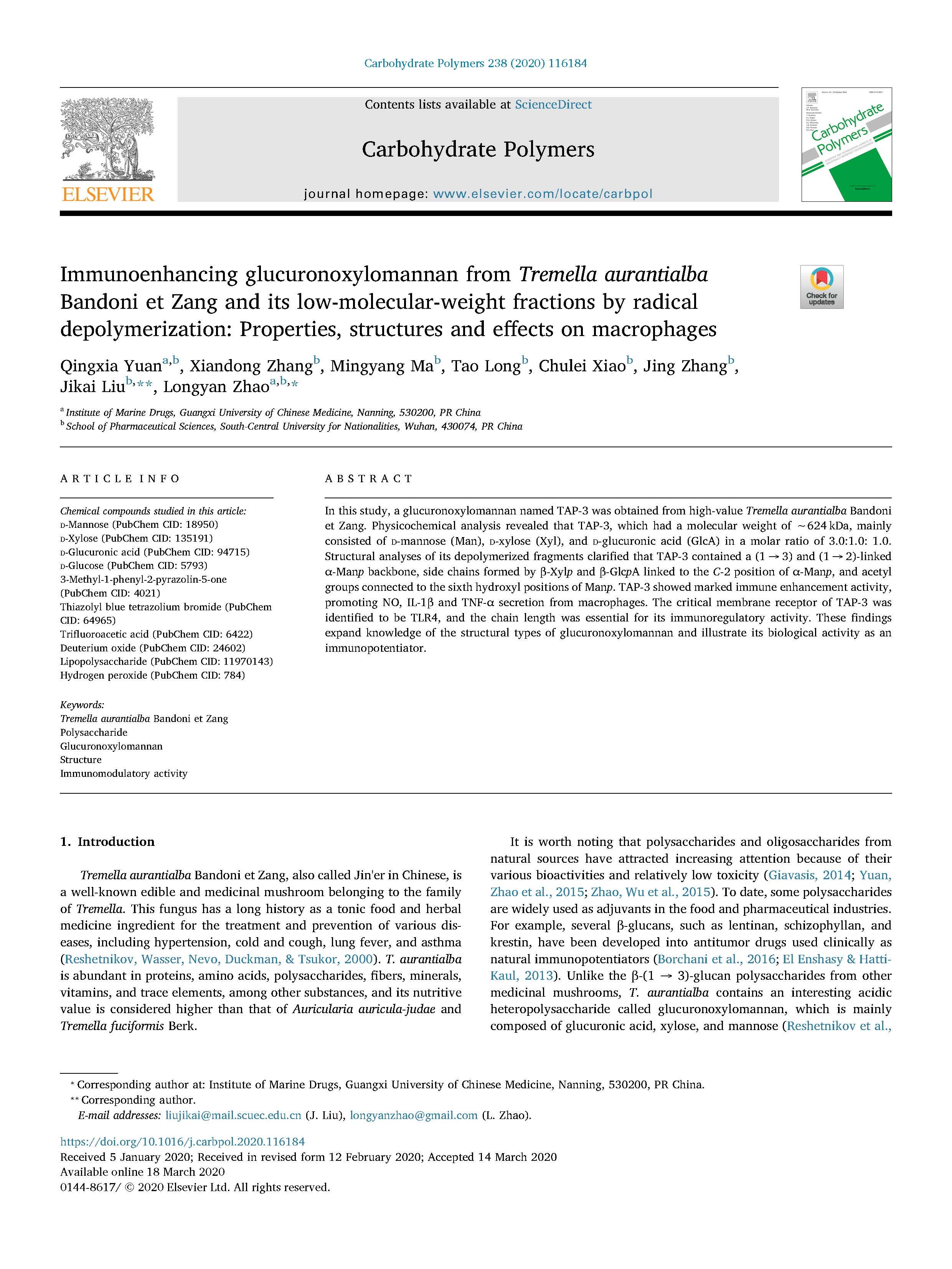 2020-Immunoenhancing glucuronoxylomannan from Tremella aurantialba Bandoni et Zang and its low-molecular-weight fractions by radical depolymerization: Properties, structures and effects on macrophages 发布时间:2020-10-21 15:24:10 浏览次数: 次 【字体:小 大】 分享到: 【打印正文】
