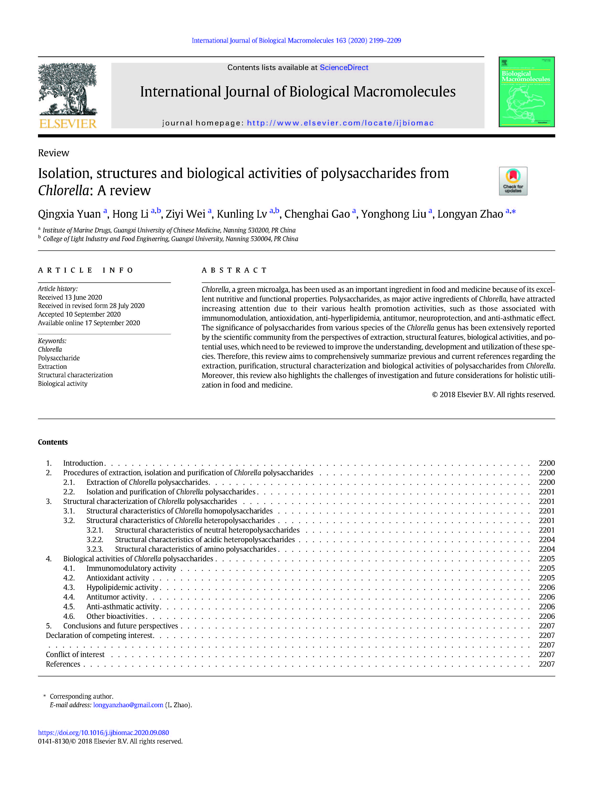 2020-Isolation, structures and biological activities of polysaccharides from Chlorella: A review 发布时间:2021-01-18 14:33:50 浏览次数: 次 【字体:小 大】 分享到: 【打印正文】