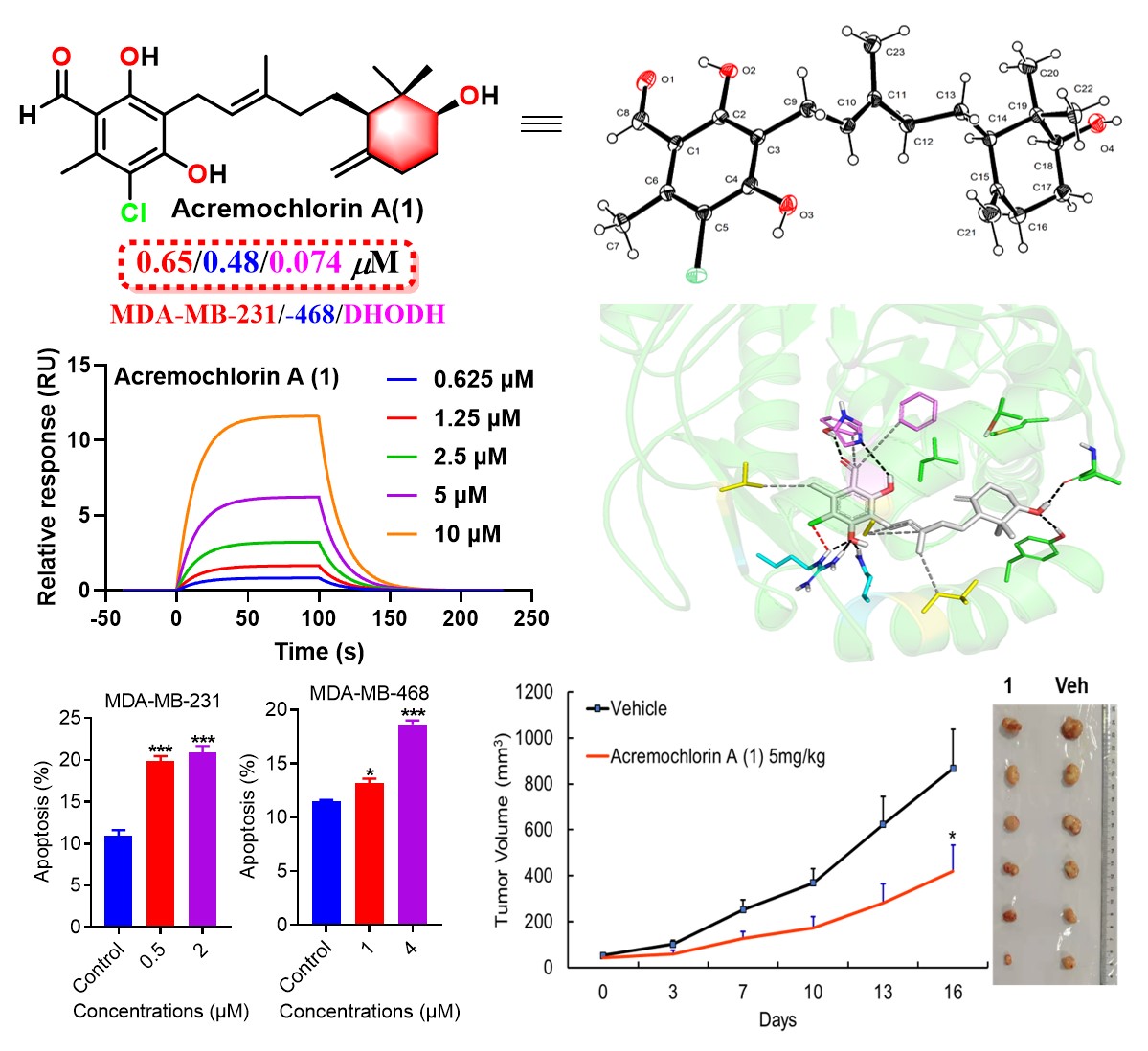 珊瑚礁是北部湾极具有代表性的典型海洋生态系统,被誉为海洋中的热带雨林,蕴育着极其丰富并具药用价值的海洋(微)生物资源。近年来,罗小卫博士聚焦北部湾海洋真菌新颖活性代谢产物的发现与评价研究,从珊瑚礁、红树林等典型海洋生态系统来源真菌中,发现系列结构多样且富含卤素、氮等杂原子的新颖活性化合物。近日在北部湾珊瑚共附生真菌来源壳二孢氯素抗肿瘤化学生物学研究方面取得新进展。基于HPLC-DAD导向分离策略,从涠洲岛珊瑚共附生菌核生枝顶孢菌GXIMD 02501中定向获得25个结构多样的ASC类化合物,含新化合物13个,其中倍半萜环系呈多样化。活性筛选发现该类化合物对hDHODH和TNBC细胞株(MDA-MB-231/-468)具有显著抑制作用,经SPR实验和分子对接深入分析发现活性显著化合物acremochlorin A (1)与DHODH结合力也最强(KD= 3.26 μM),是一个强效hDHODH抑制剂(74 nM),能选择性抑制TNBC细胞的增殖。研究发现hDHODH是TNBC细胞增殖和存活所必需的,并且活性ASC类化合物通过抑制hDHODH显著抑制TNBC细胞生长并诱导其凋亡。此外,新颖强效hDHODH抑制剂(1和21)可有效抑制PDX模型三阴性乳腺肿瘤的生长,且对小鼠无明显的体重减轻或毒性作用,安全性优于经典的DHODH抑制剂布喹那。本研究报道了一种海洋来源新颖强效hDHODH 抑制剂(1),为难治性TNBC提供先导化合物。此外,我们还初步阐明了一个溴代ASC类衍生物(3-bromoascochlorin)基于抑制MAPK通路抗非小细胞肺癌的作用机制(Cell Biol. Int., 2021, doi: 10.1002/cbin.11674.)。上述研究极大拓展了ASC类化合物的结构多样性,突显了北部湾海洋微生物天然产物在抗高发肿瘤候选药物发现方面具有重要的研究价值。