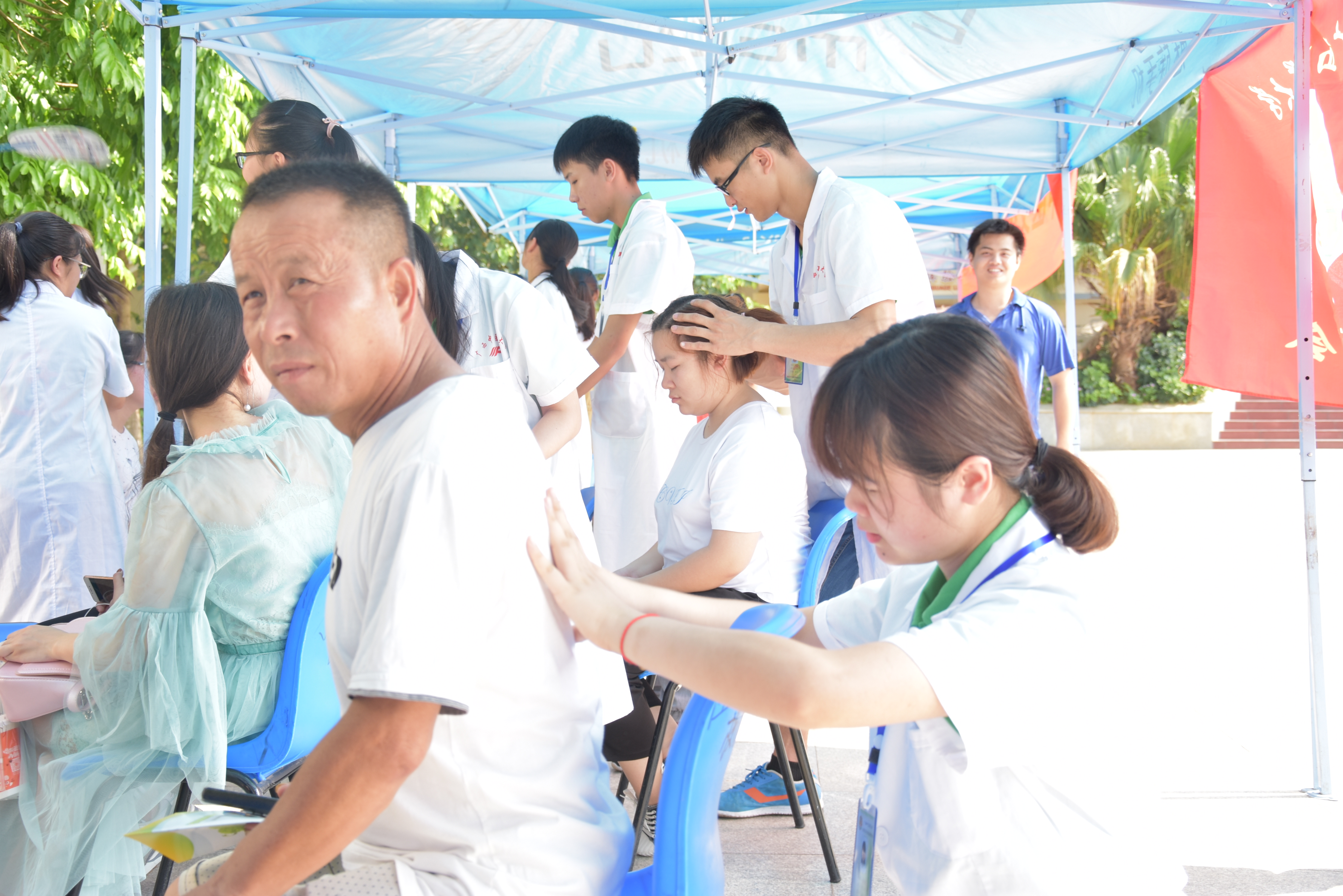 烈日底下,同学们搭好帐篷,摆好桌椅,拿出器材,便开始了此次社会实践活动。同学们分工明确,合理安排,一部分同学去分发传单,宣传本次活以及十九大精神,一部分同学严阵以待,为老师、居民以及同学们做一些常规检查和医疗保健按摩等。本次活动内容丰富多彩,有量血压,手法推拿按摩,中医药文化知识和党的十九大精神宣讲、图片展示,更有深得中医药精髓的艾灸和刮痧。闻名而来的人络绎不绝,都想尝试一下这传统保健的医疗方法,空中弥漫着艾草的香气,同时也充满了中医药文化知识的氛围。
