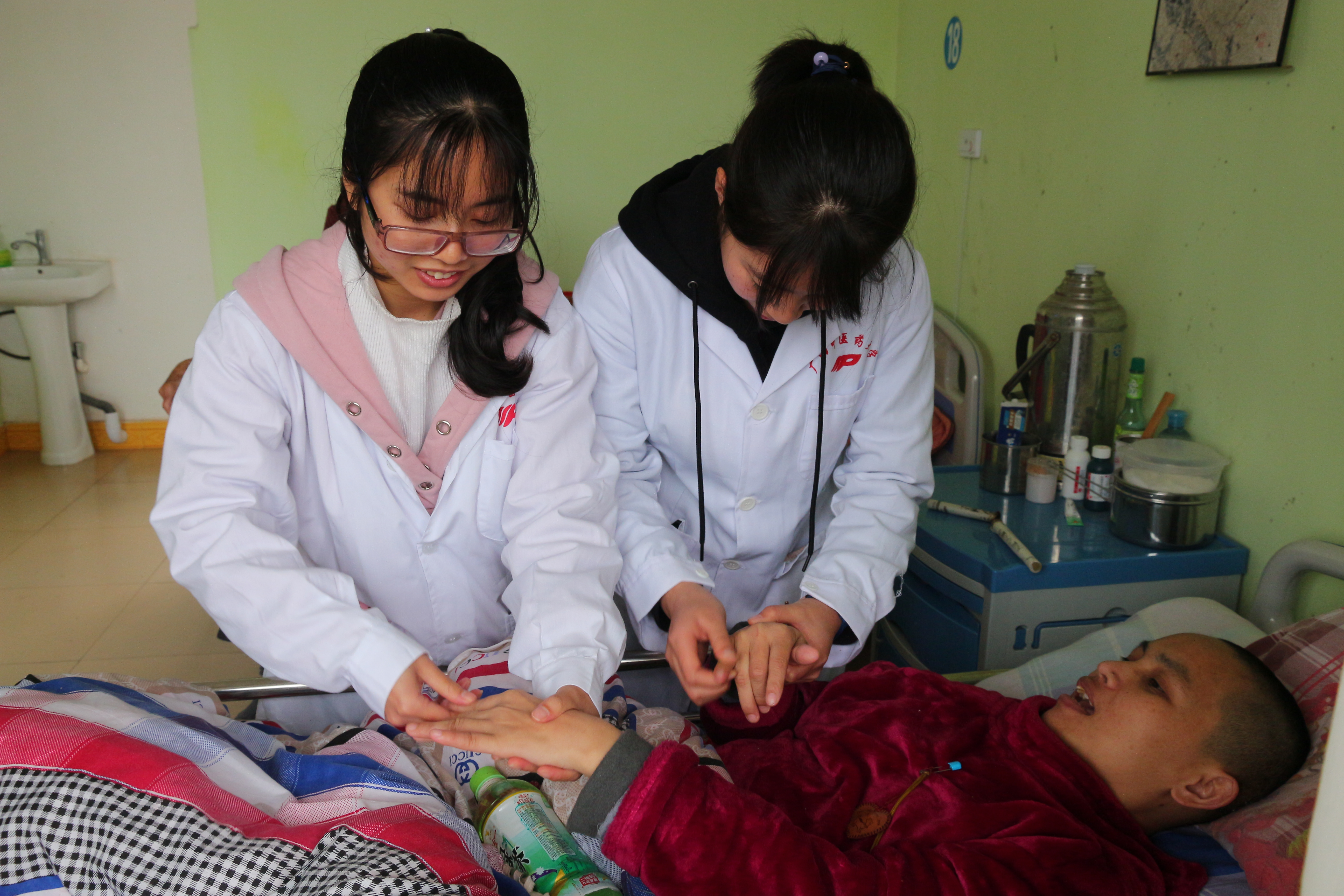 为老人进行手部按摩