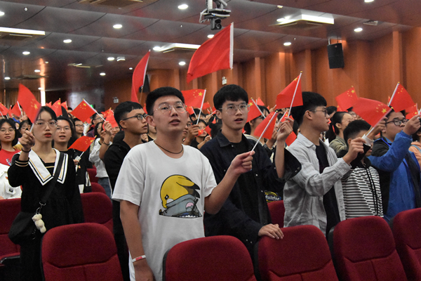 会议尾声,会场内红旗飘扬,全场师生挥动手中小红旗齐声高唱《我和我的祖国》,礼毕高呼三声“祖国,我爱你”,会场燃爆奔涌的爱国浪潮,同学们心情久久无法平静。