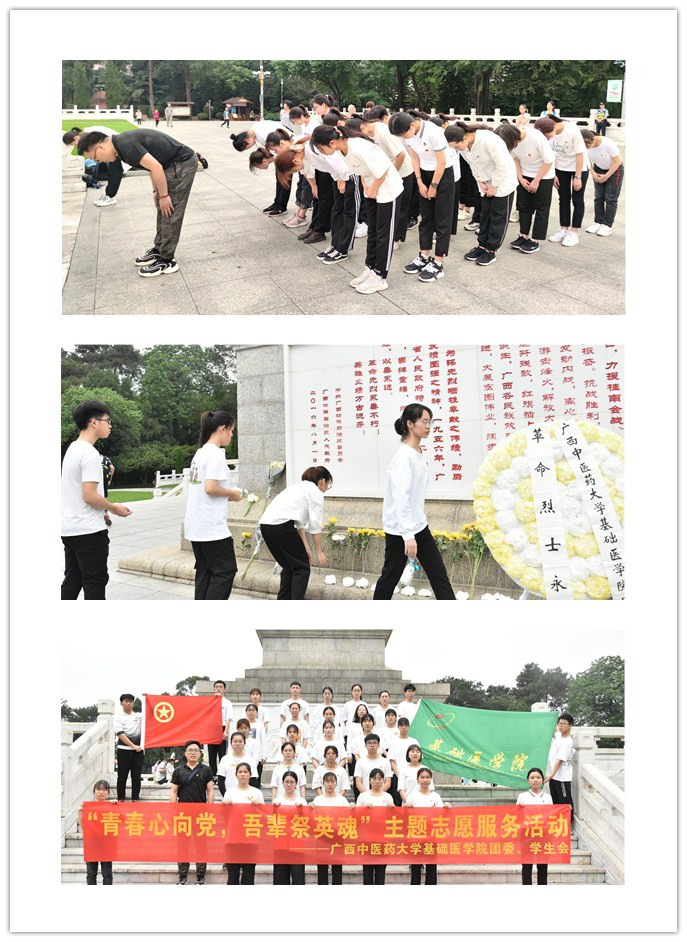 基础医学院团委、学生会成员代表40余人,统一着装、佩戴团徽,静静地肃立烈士纪念碑前。活动在高亢激昂国歌声中拉开帷幕。首先,播放哀曲,气氛庄严肃穆,全体成员向革命烈士默哀一分钟。这一分钟,仿佛时间又将我们带回到那烽火硝烟,革命斗争的年代,无数革命先烈,用热血、用青春、有生命去守护共产党人初心和使命,让我们浑身充满斗志和力量。然后,成员代表向烈士纪念碑敬献花圈,同时全体成员迈着沉重有力步伐,依次走向烈士纪念碑献上手中菊花,瞻仰纪念碑,并向革命烈士纪念碑三鞠躬,表达无比怀念和崇敬之情。这一刻,好像革命先烈依旧在我们身边,有他们伟岸身躯和强大精神激励着和守护着我们一代又一代中华儿女随后。成员代表向大家讲述纪念碑来历和广西革命史,在场成员无不被革命先烈坚定信仰和崇高精神所感动。随后,和卫宾老师向革命先烈致悼词,表达对先烈无尽缅怀和感恩之情,也希望我们大家不忘初心,牢记使命,继承先烈意志,奋发学习,为党和国家奉献青春力量。然后,全体成员高举右手,面向纪念碑,重温《医学生誓词》,用医学生坚定信念和决心,抒发爱国、爱党之情。最后,祭奠先烈仪式在庄重的《国际歌》声中落下帷幕。仪式结束之后,为了贯彻党中央学习党史精神,全体成员前往镇宁炮台、毛泽东接见各族人民纪念馆等参观,学习广西革命史和党史,通过一张张历史张片,一件件历史物件,唤起沉睡历史。