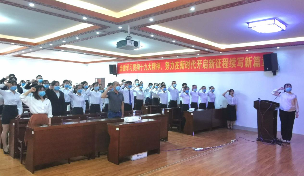 会上,面向鲜红的党旗,龙春莉带领与会新党员进行了入党宣誓,老党员重温入党誓词。梁秀豪同志代表新发展党员讲话,表达入党意愿和坚决跟党走的决心。此外,会议还包括正式党员为预备党员佩戴党徽等议程。