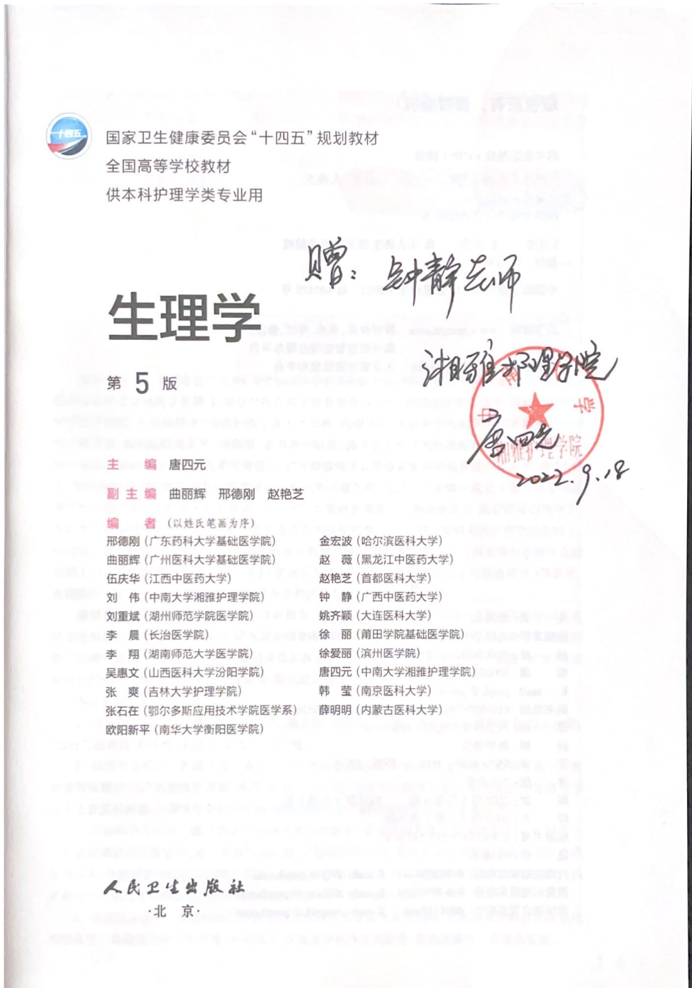 钟静老师参编国家卫生健康委员会“十四五”规划教材“《生理学》 发布时间:2023-05-08 15:09:37 浏览次数: 次 【字体:小 大】 钟静(编委),国家卫生健康委员会“十四五”规划教材,全国高等学校教材,供本科护理学类专业用《生理学》,人民卫生出版社,2022.7 7.伍冠一(编委),生理学实验,人民卫生出版社,2022.8 分享到: 【打印正文】